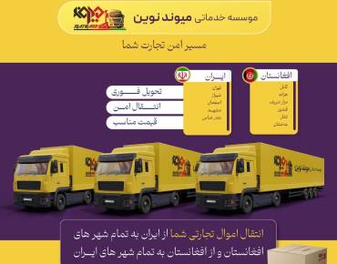 موئسسه خدماتی میوند نوین خدمات باربری در افغانستان با هدف سهولت در زندگی هموطنان عزیز تأسیس گردیده است. این موئسسه با ارائه خدمات متنوع در بخشهای حملونقل بینالمللی، خدمات حقوقی و مشاورهای، و همچنین خدمات مسافرتی و هوایی، تلاش مینماید تا با صداقت، سرعت و کیفیت بالا پاسخگوی نیازهای مراجعین خود باشد. تعهد ما جلب رضایت مشتریان و ایجاد اعتماد پایدار در هر خدمت است.